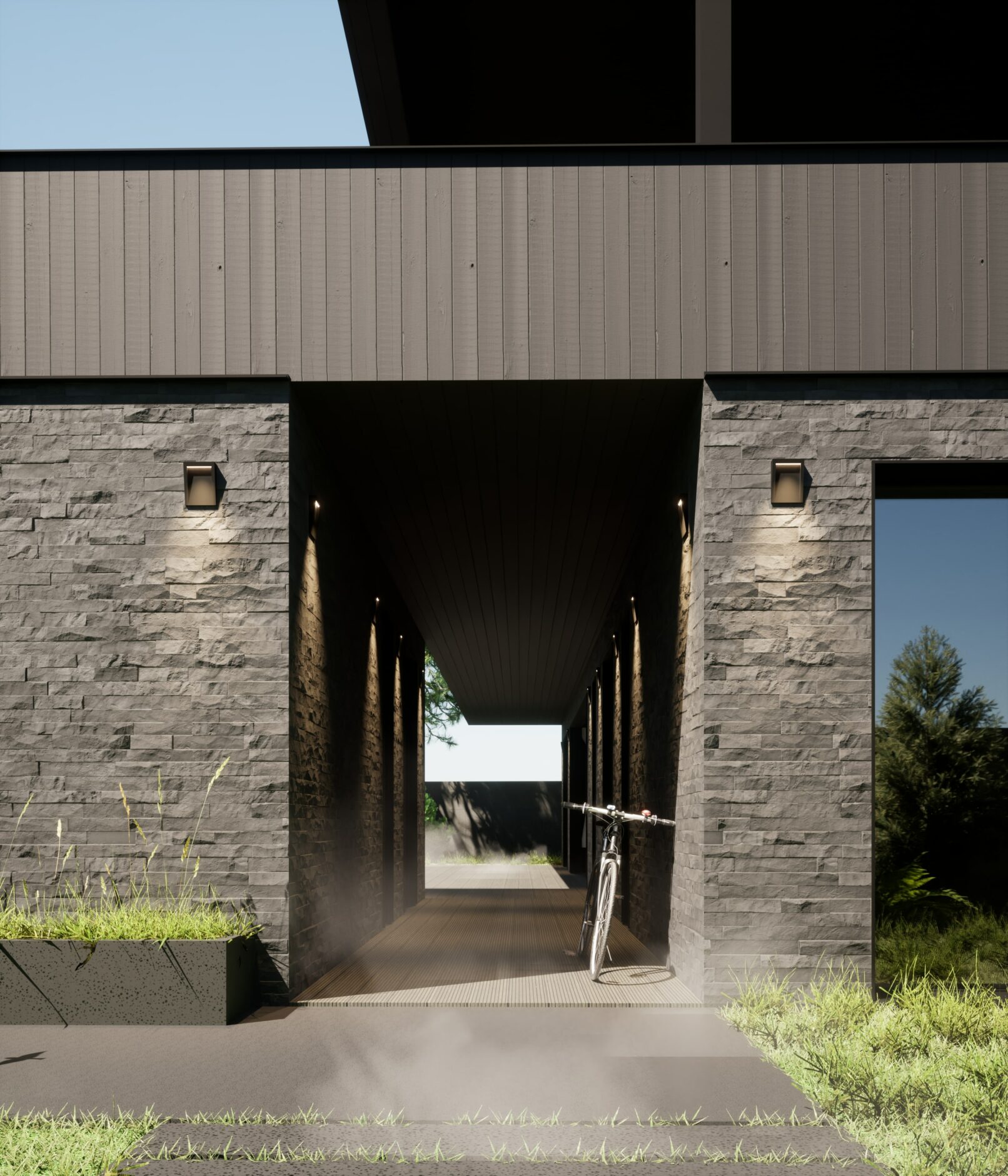 Жилой дом в посёлке Истра выполнен в современной лаконичной стилистике. Архитектура построена на сочетании двух выразительных материалов: камня тёмного оттенка в отделке первого этажа и вертикальной деревянной обшивки на втором. Контраст фактур подчёркивает горизонтальное деление объёмов и усиливает цельность архитектурного образа.