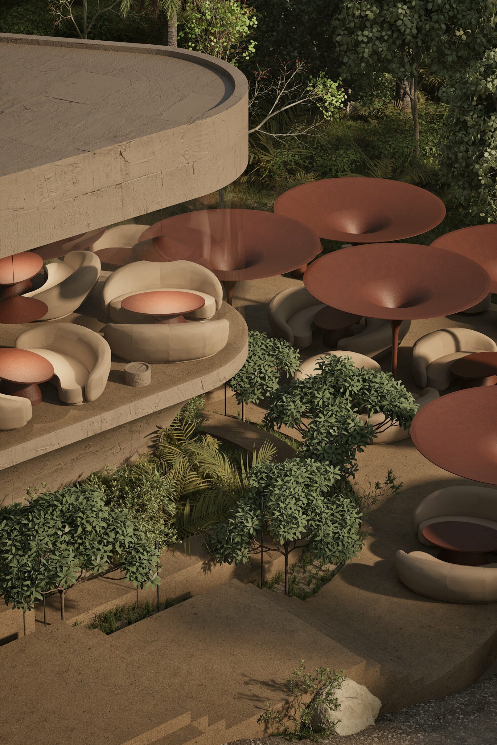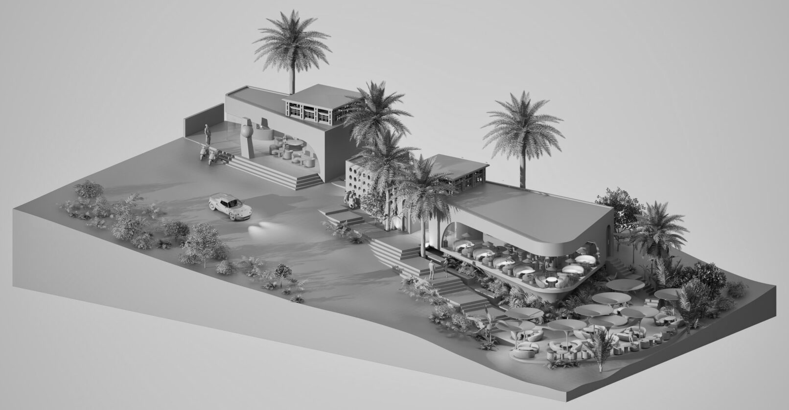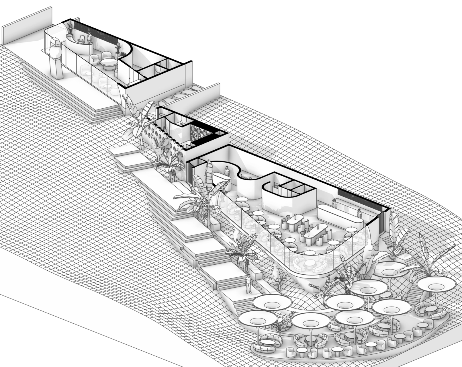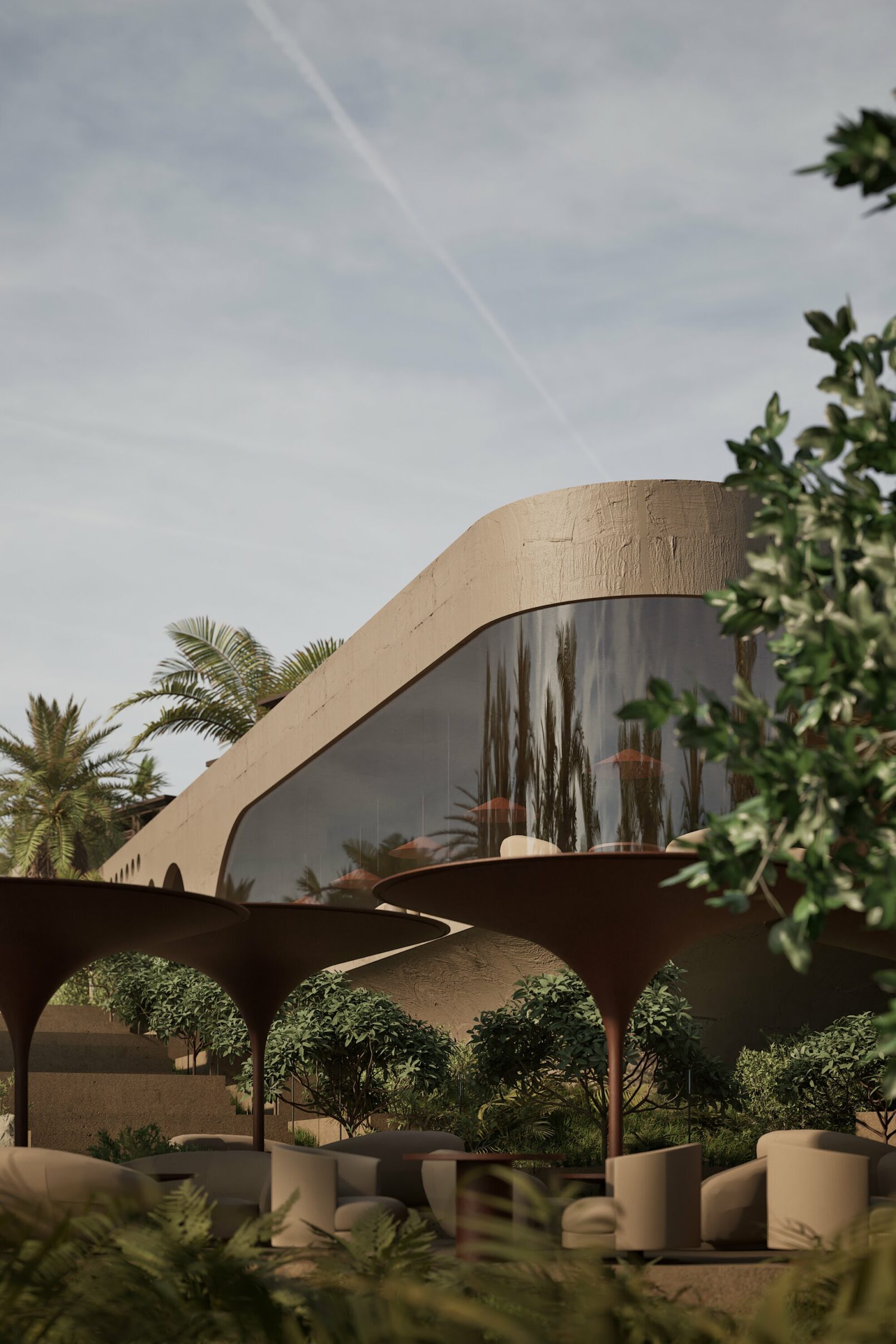 Фасадной частью комплекса вилл «ORIGINS» в Nuanu City служит коммерческое здание ресторана, ресепшн поселка и скрытая между ними прачечная. Линия имеет достаточно сильный перепад высот, перед нами стояла задача максимально эффективно использовать оставшиеся площади, узкие места и сложный рельеф. Здание ресторана, массивной консолью встречает посетителей и жильцов комплекса.