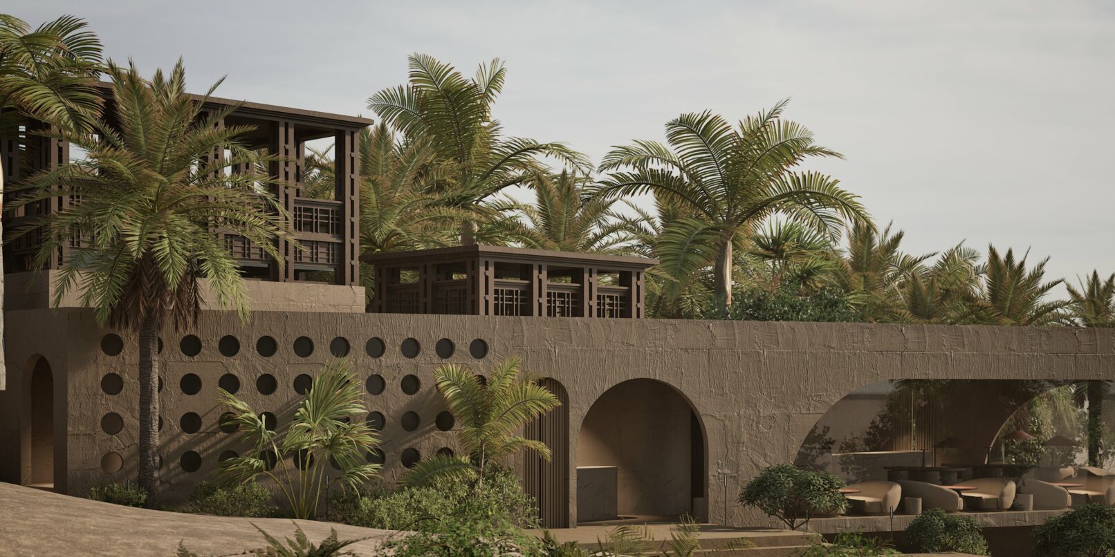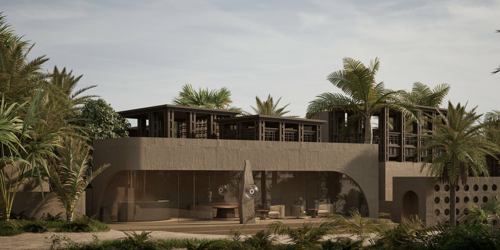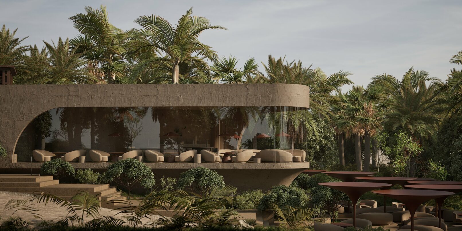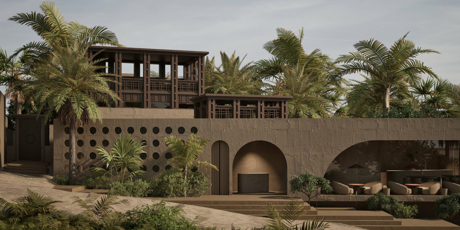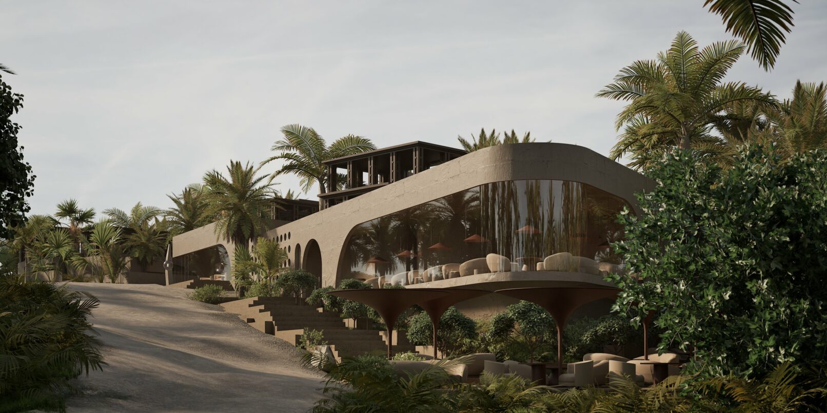 Фасадной частью комплекса вилл «ORIGINS» в Nuanu City служит коммерческое здание ресторана, ресепшн поселка и скрытая между ними прачечная. Линия имеет достаточно сильный перепад высот, перед нами стояла задача максимально эффективно использовать оставшиеся площади, узкие места и сложный рельеф. Здание ресторана, массивной консолью встречает посетителей и жильцов комплекса.